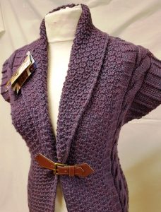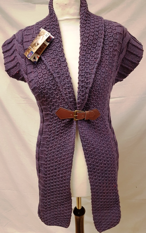100% British wool, sleeveless buckle , arran/honeycomb and cable knits, lapel collar, above knee length, easy to wear, PU strap buckle, dropped shoulder garment slightly tapered, well detailed made in the UK
