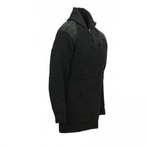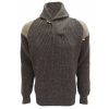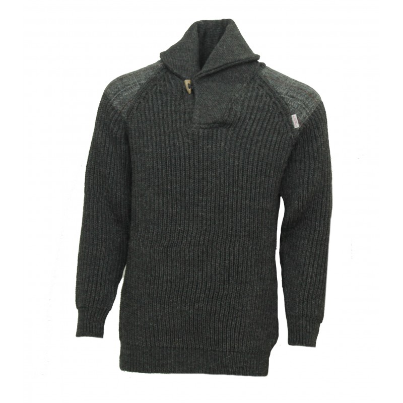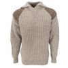 Shawl neck with horn button classic fishermen knitted garment with harriss tweed patches natural colour made from 100% jacob wool undyed wool colour light grey welsh this is a regular fitting garnment 4ply heavy chunky knit