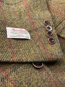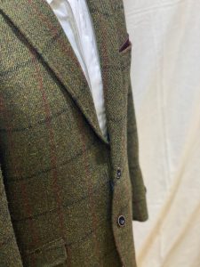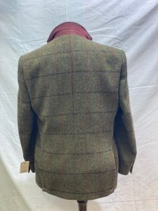 High quality Harriss Tweed Jacket, hand woven in the western isles, on the island of Harriss Scotland. fine example of classic man’s jacket, traditional regular fit jacket with 3 pockets outside, 2 pockets inside,fully lined with the harriss tweed logo, colour deep forrest with red/dark brown lines, red back of collar ,