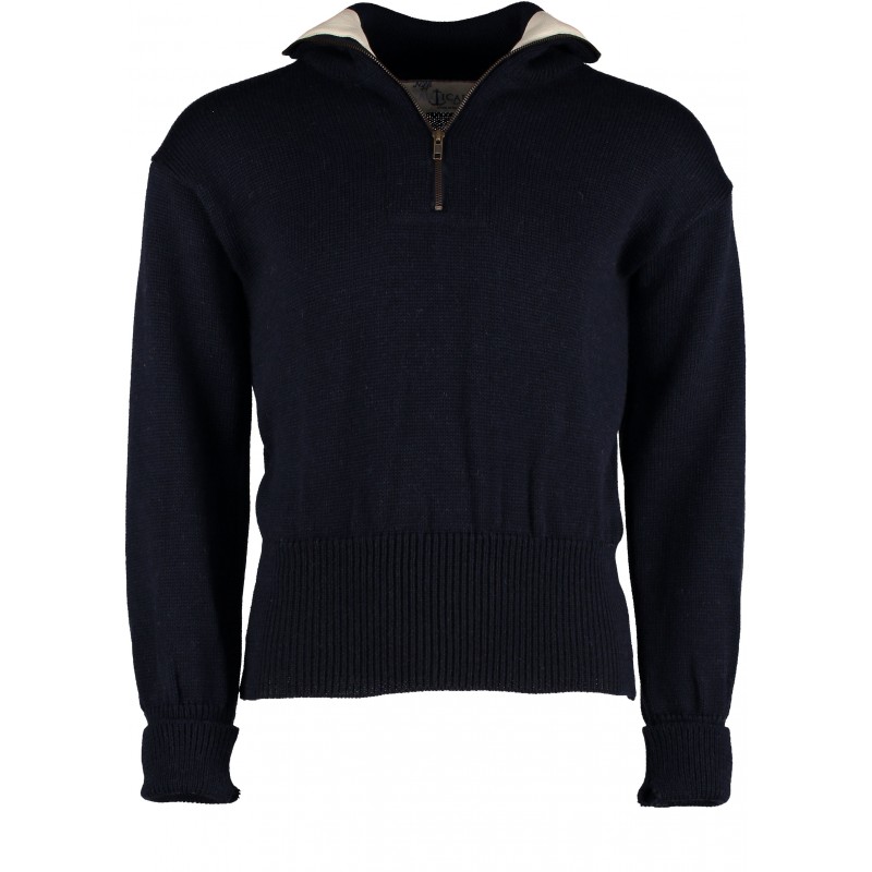 Quarter zip seaman’s sweater inspired by the submarine film “Das Boot” fitted with a bronzed YKK zip and the inside of the collar has a 100% natural cotton twill band to complete the classic appearance of the German submariner sweater.