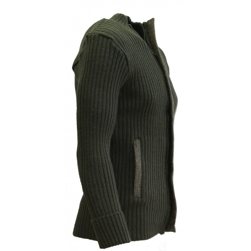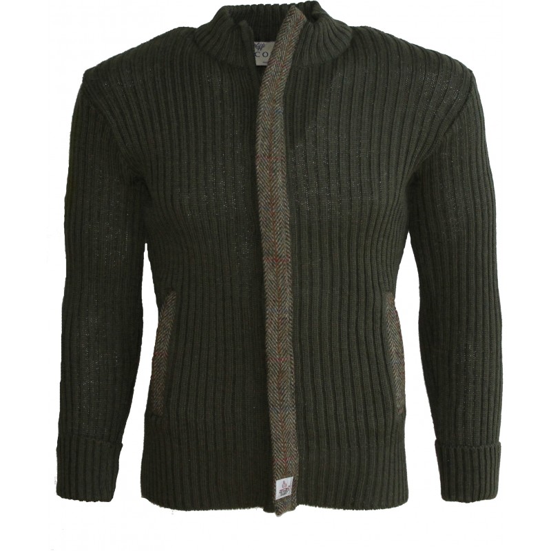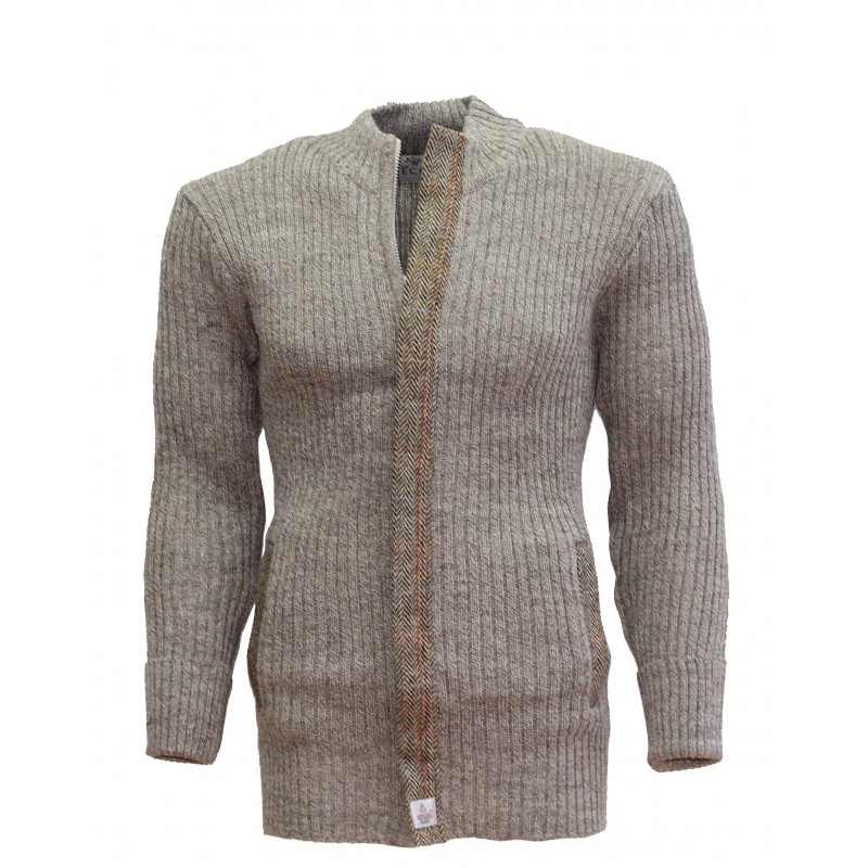 Full zip cardigan with full front placket in Harris Tweed and 2 integral zip closing side pockets with Harris tweed zip guard to pockets made from 100% British Wool.