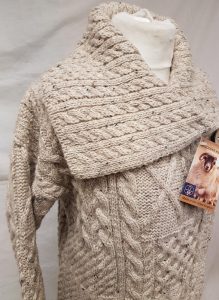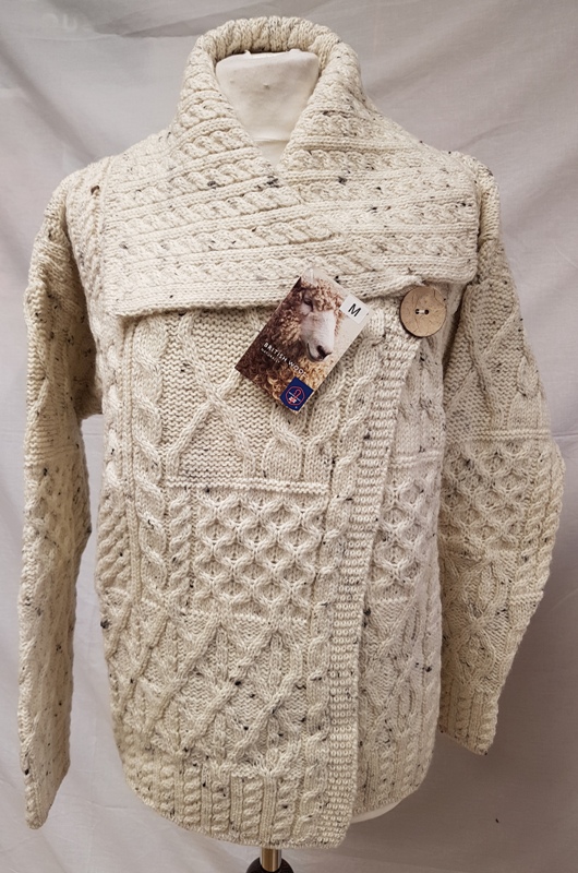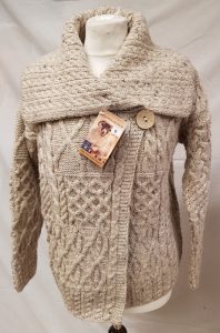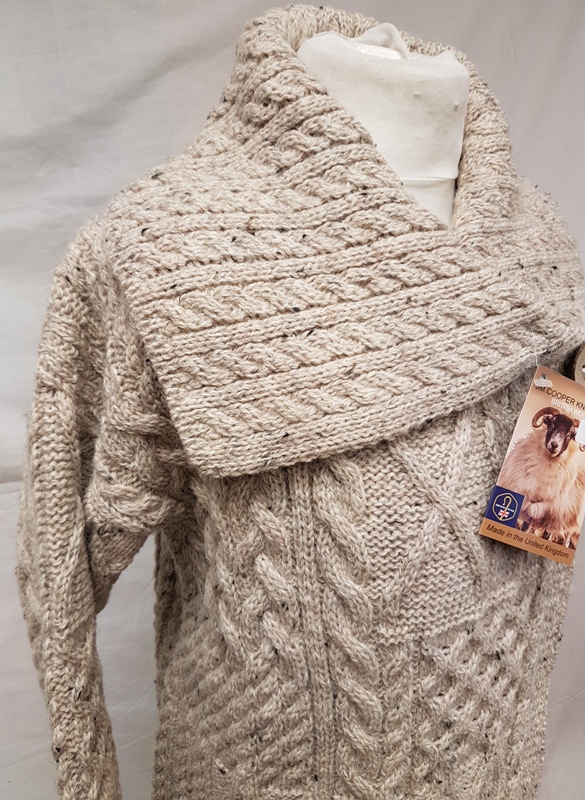 Wide Colloar cardigan wrap with one button on inside and one button on the outside heavy knit cardigan with all fours classic cable designs colour oatmeal, regular to calssic fitting garment using only the finest British wool