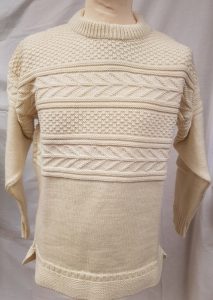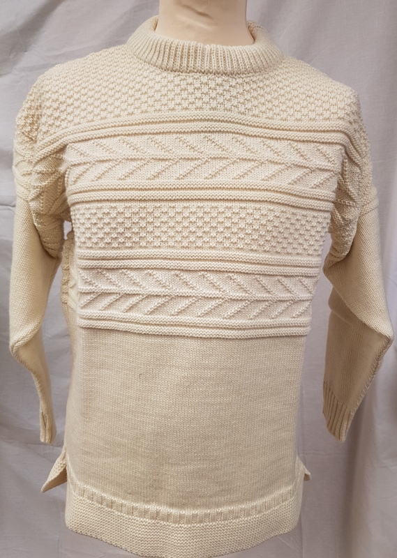 British wool, made in the UK one colour fairilse sweater with straight base and banded cuffs 4 ply double knit, heavy gauge double neck, 100% wool, colour cream