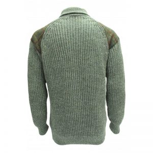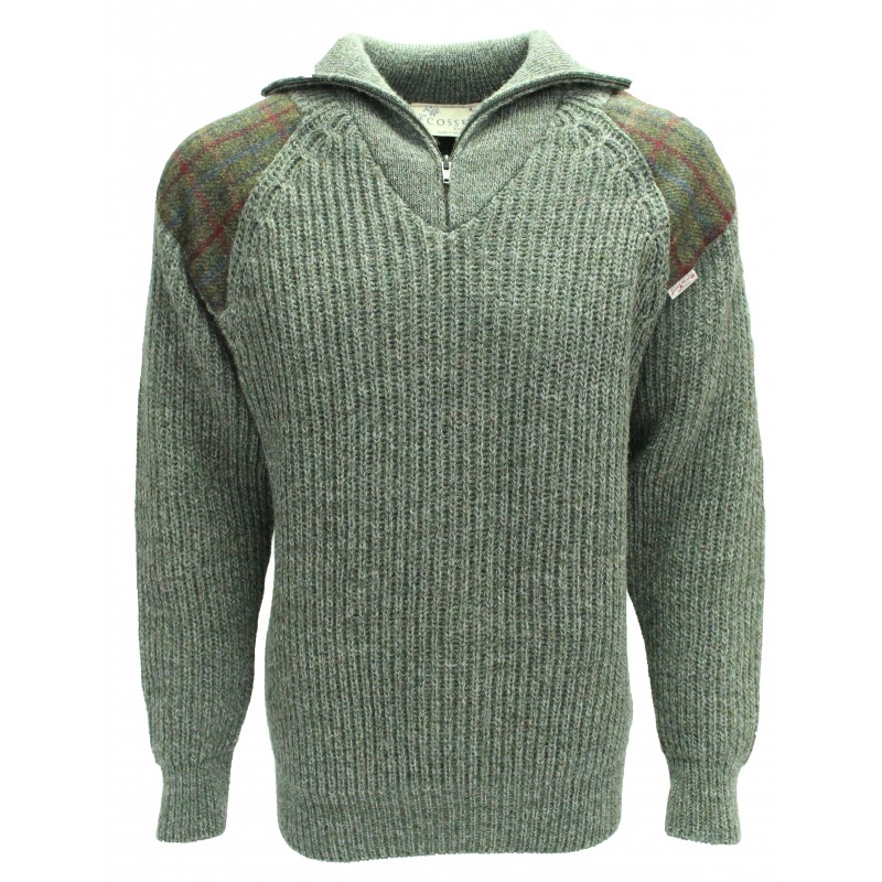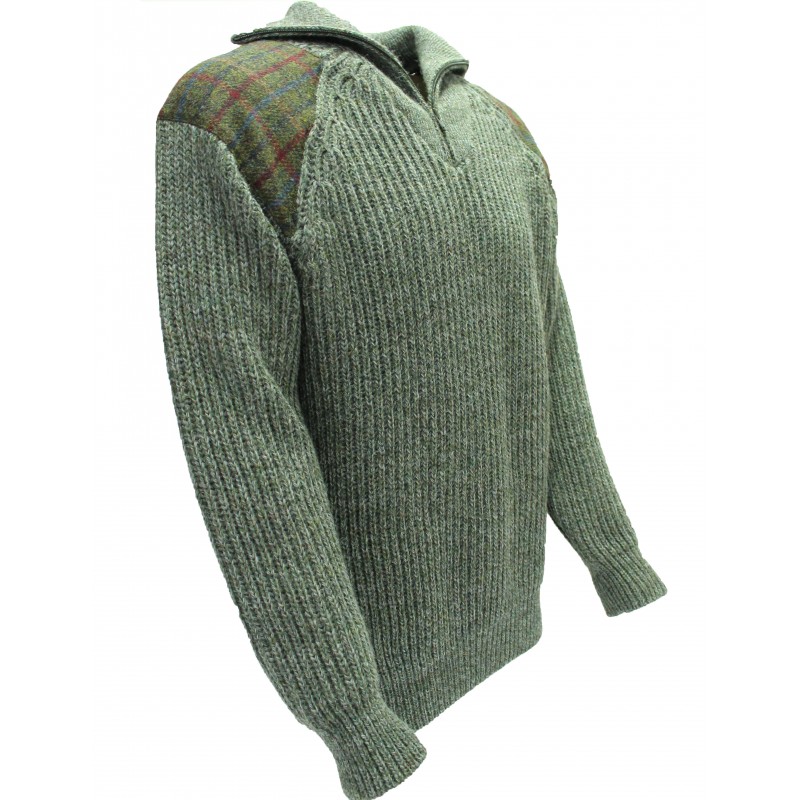 Quater Zip Sweater classic fishermen knitted garment with harriss tweed patches natural colour made from 100% jacob wool colour Derby Tweed this is a regular fitting garnment 4ply heavy chunky knit