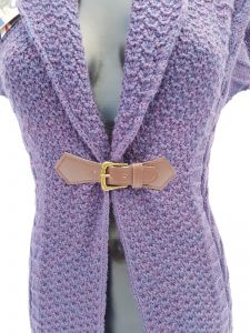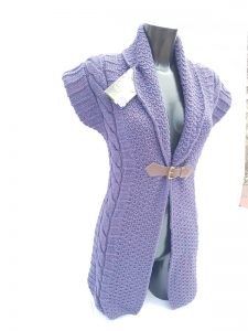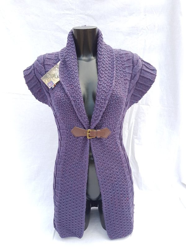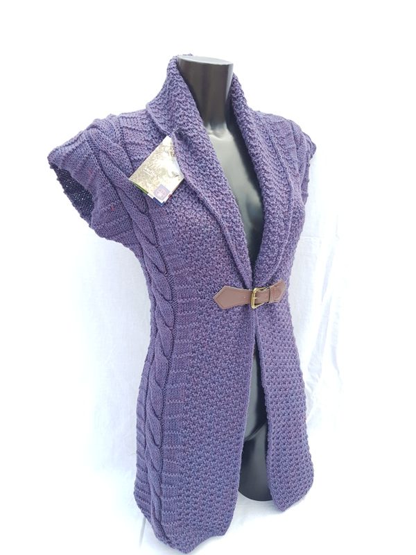 Ladies sleeveless buckle with lapel collar with arran, honycomb knit this garment if fitted to give it the shape, 100% british wool made in the UK, easy to wear, body cosy with arms free,