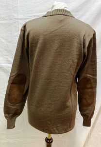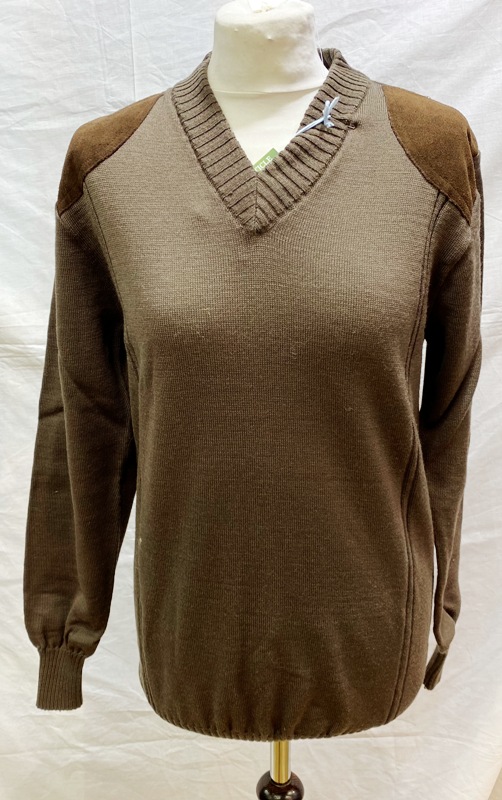 Woolyback quality british knitwear, classic fine knit V neck pullover with brown suede patches on shoulders and elbows 100% pure new wool bolour biscuit brown .