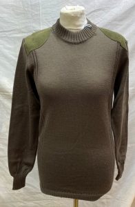 Woolyback Quality british knitwear, 100% pure new wool crew neck sweater with green patches on shoulders and elbows , colour sage green, ribbed neck line