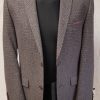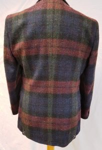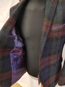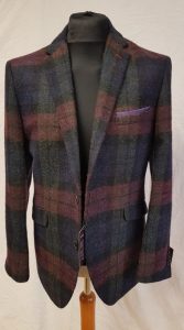 Heavy wieght Tweed Jacke, 72% Wool 22% polyester 6% Mohair, made in UK, classic boxed square detailed, colour dark blue/green/burgundy, fully lined with lilac colour linning, 3 pockets outside, 3 pockets inside with 4 buttons on cuffs regular fitting jacket