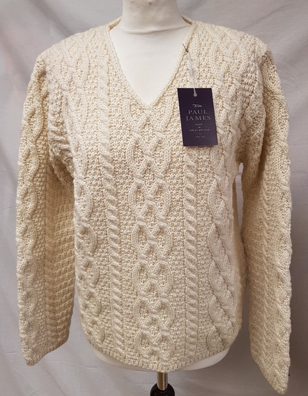 Paul James Knitwear, classic V neck sweater made in UK, heavy knit arran cable designs , made with 100% pur new merino wool, colour ecru